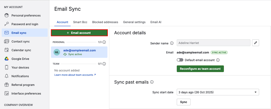 Click ”+ Email account“ to add another email account.