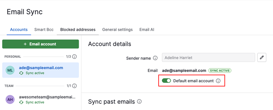 Your default email account is the primary account Pipedrive uses to send emails, including emails sent through automations. It also appears first when composing emails in your Sales Inbox or item detail views.