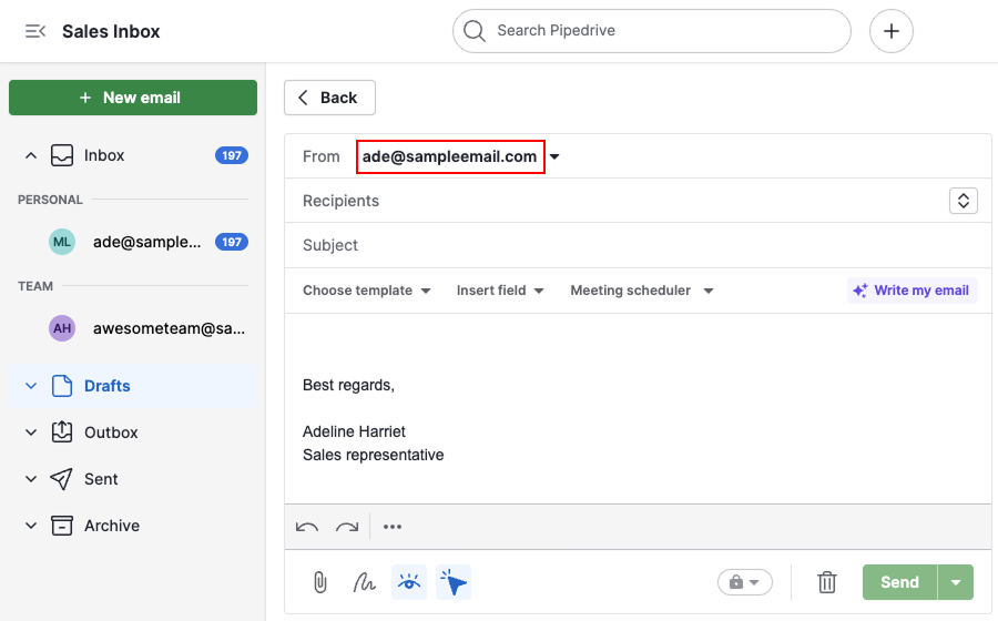 Once set, this account appears first when composing emails in Pipedrive. To switch the sender, click the from field, then choose another synced account.