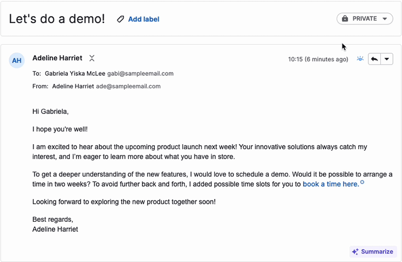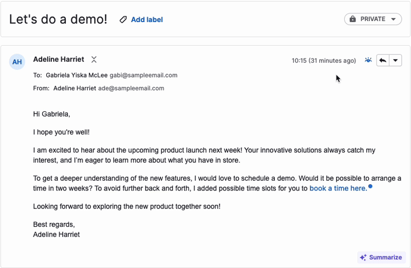 Pokud je viditelnost vašeho e-mailu nastavena na sdílenou, spolupracovníci s přístupem k propojeným položkám uvidí aktivitu sledování také ve svých příslušných detailních zobrazeních.