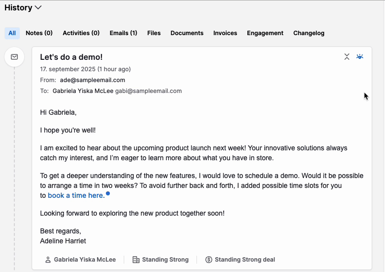 Sledování e-mailů vám ukáže, kdy někdo otevře e-mail, který jste odeslali z Pipedrive, nebo klikne na odkaz v něm. To vám pomůže pochopit míru zapojení a navázat následnou komunikaci ve správný okamžik.