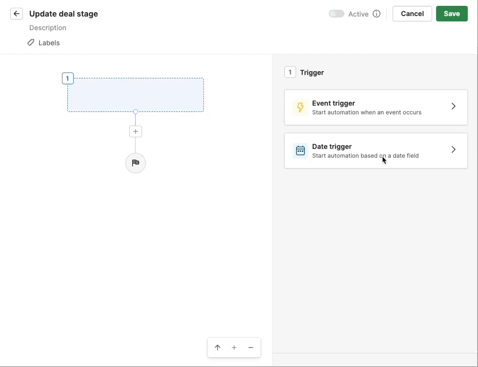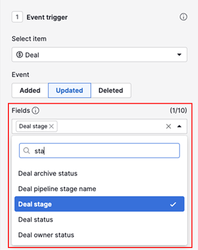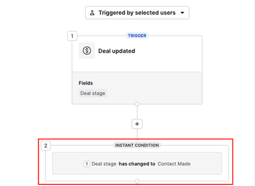 If you don’t want the automation to run on every field update, add conditions after the trigger to define what must be true. For example, if you monitor the deal stage field, add a condition specifying the deal stage name.