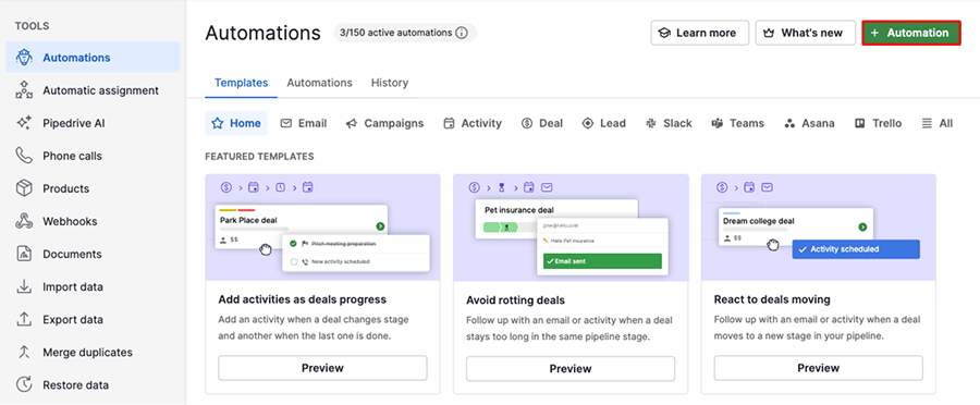Open the account menu in the top-right corner, go to Tools and apps > Automations and click “+ Automation”.