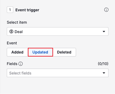 Select “Event trigger” and choose which item activates your automation. You can select activity, deal, lead, organization, person or project.