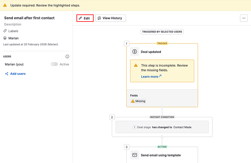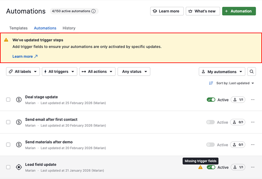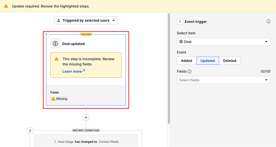 If your trigger uses the update event without selected fields, you’ll see a warning to update it.