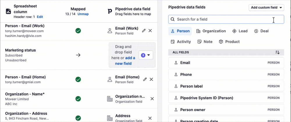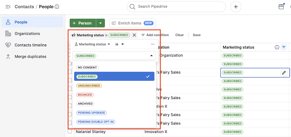 In Pipedrive, the marketing status is attached to an email address. While it‘s shown on a person contact, the status exists independently of the contact record itself. If a person has multiple email addresses, the status is linked to the main one shown on the contact.
