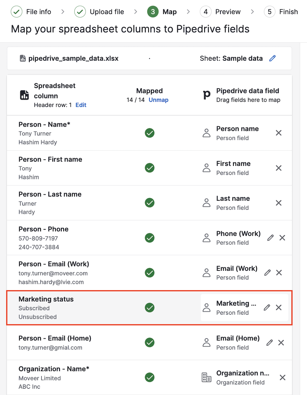 You can also add a contact‘s marketing status when importing contacts into Pipedrive from a spreadsheet.