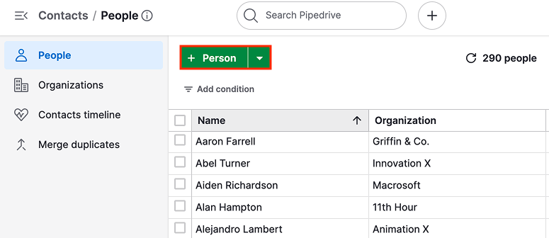 • In the list view of your people or organizations tab, you can create new contacts with the “+ Person” or “+ Organization” buttons.