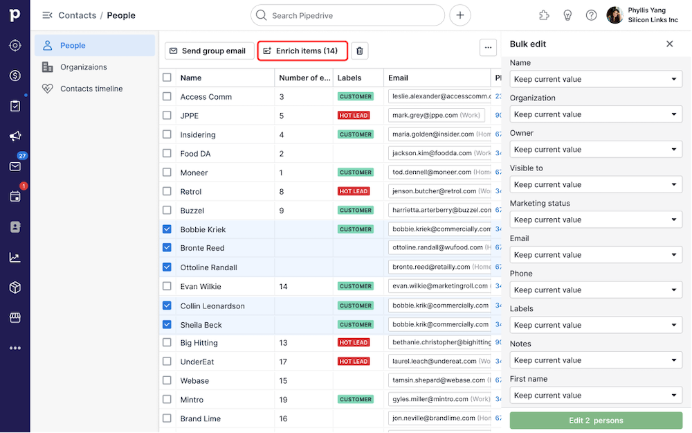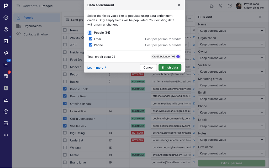 With bulk enrichment, you can enrich up to 100 people and/or organizations at once from the list view in the Contacts tab.