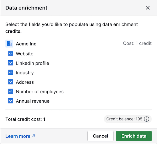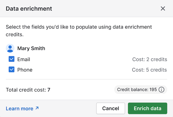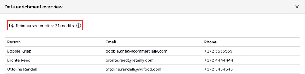 It will also show how many credits were reimbursed, which happens if the data was already filled in, or if the enrichment was unsuccessful.