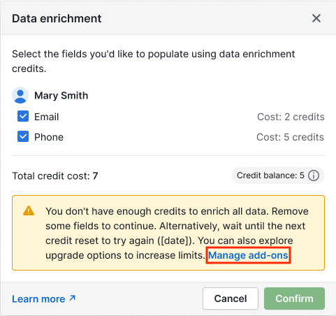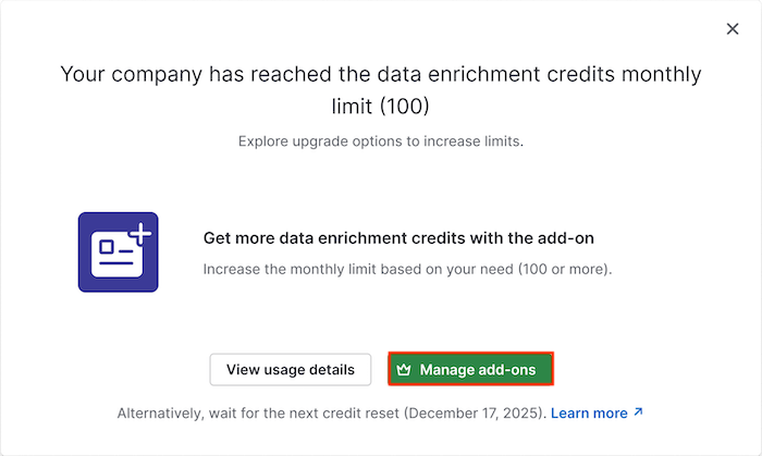 When you see a message stating that you don’t have enough credits to enrich the data you need, click on “Manage add-ons” and you‘ll be taken to the Top-ups page.