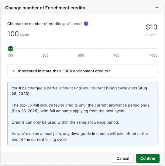 Find the Data Enrichment top-up and click the “100 credits” button to display the “Change number of Enrichment credits” modal.