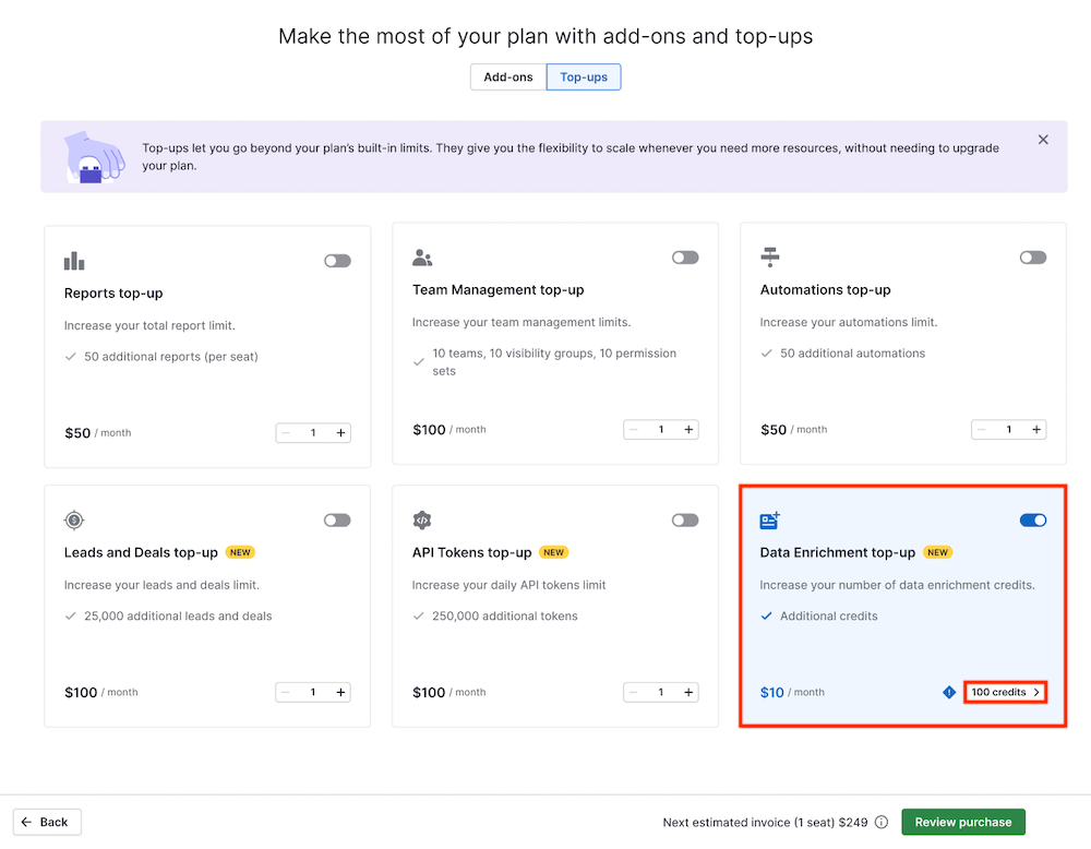 Pipedrive’s Data enrichment feature provides you with monthly credits depending on your plan. If you run out, you can now purchase additional credits to keep enriching your data without having to wait for your next monthly cycle.