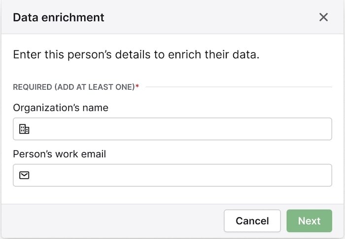To start email enrichment, you’ll need to have filled in the person’s name and either: