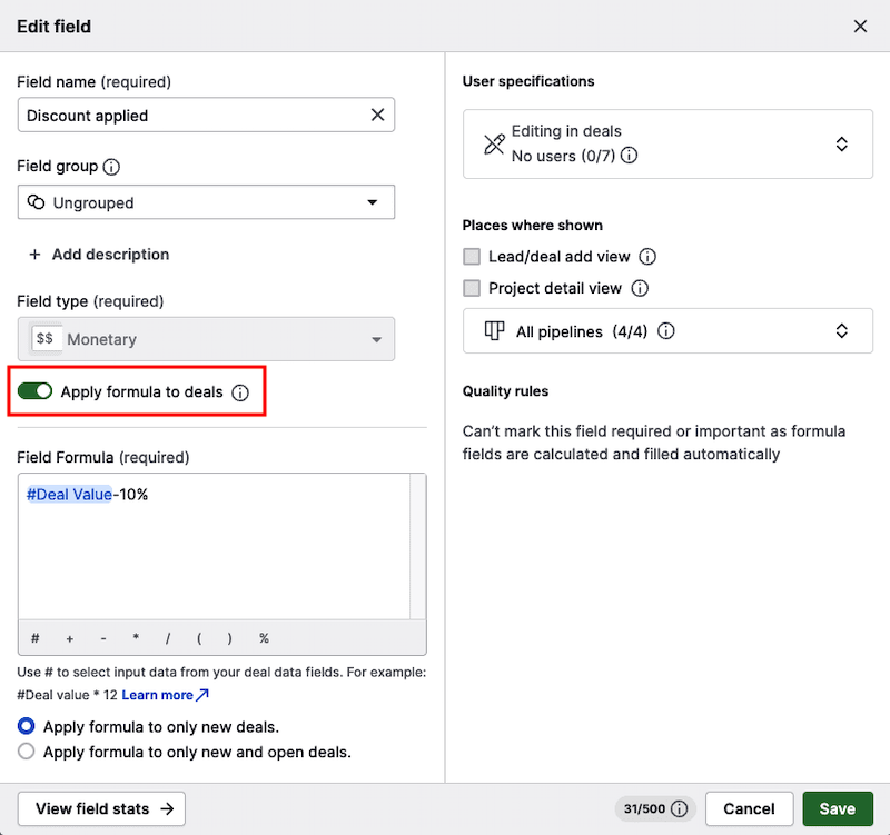 To use a formula, make sure that “Apply formula to deals” is enabled.