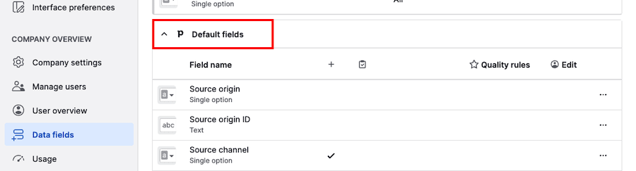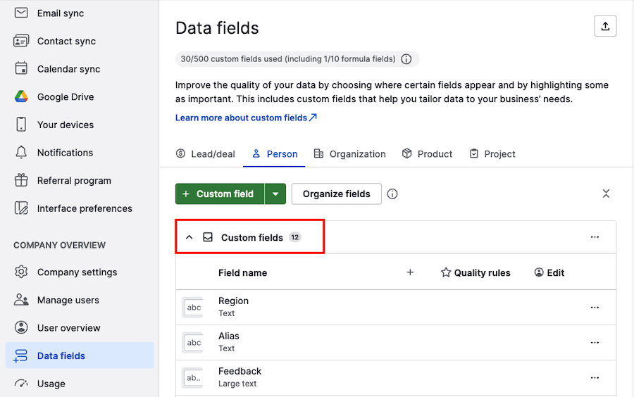 When you’ve just created your Pipedrive account, the default fields will be the first thing you see on the Data fields page. After creating some custom fields, they’ll appear right after the custom fields section.