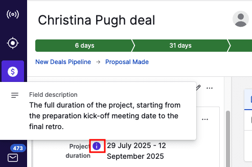 In the deal detail view, you can find the field description by clicking on the “i” icon.