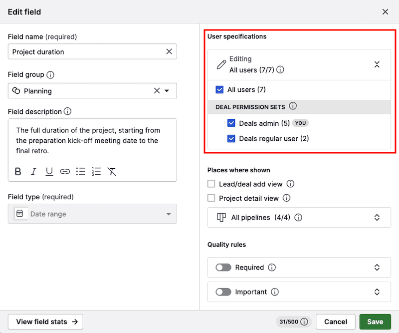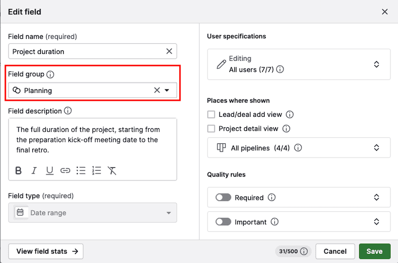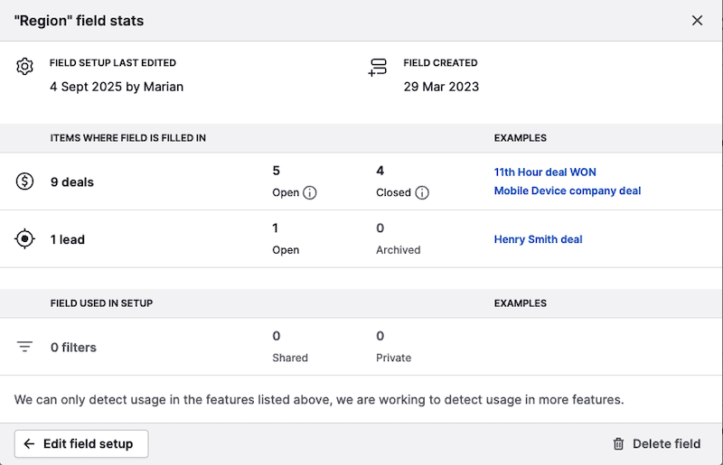 Additionally, you’ll see when the field was created or last edited and by which user.