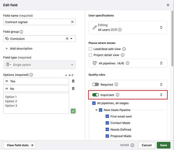 To set this up, click on the field and enable the “Important” toggle under quality rules. You can choose to apply this setting to specific pipelines or stages.