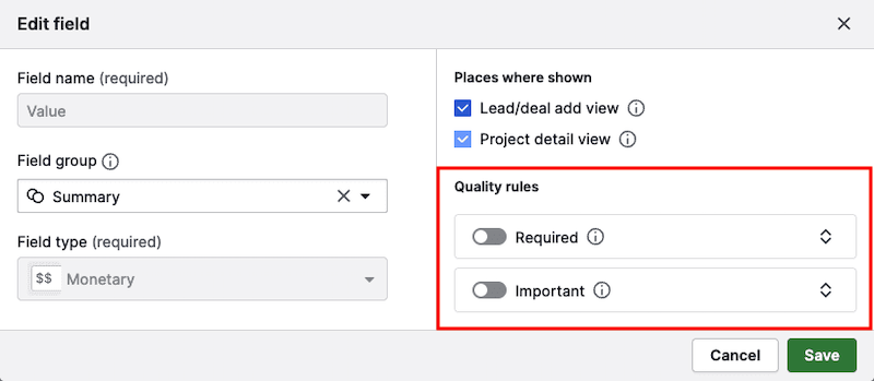 Marking fields as important helps to remind your team to fill in key deal information. If an important field is left empty, users will see a reminder in the detail view.