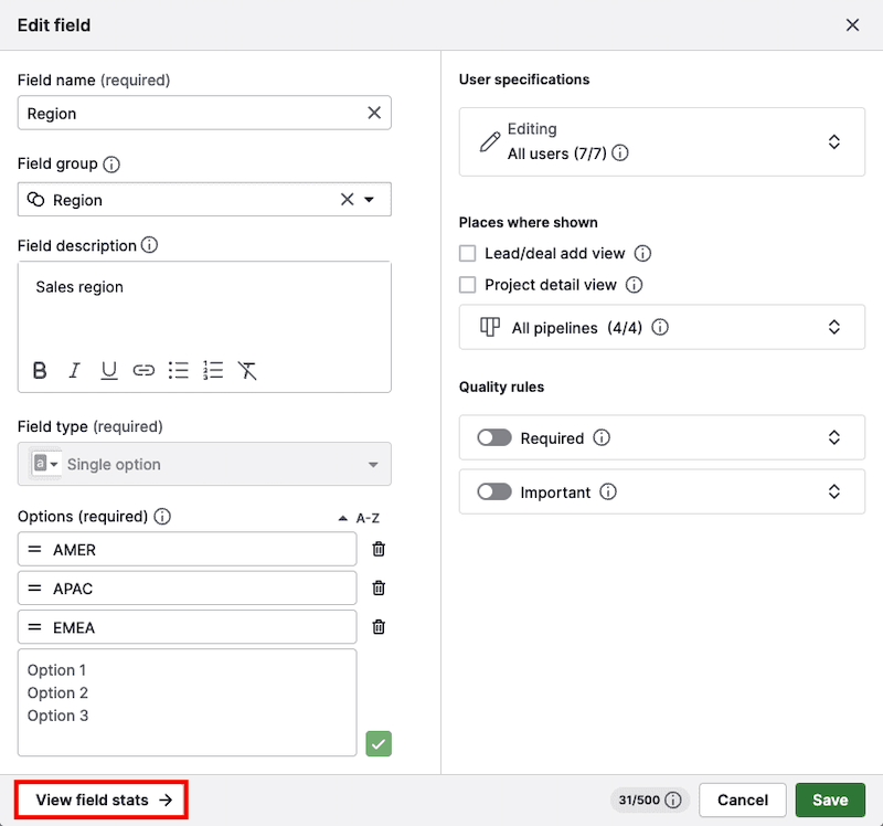 To check if your custom field contains data or is used in any filters, open the field and click on “View field stats”.