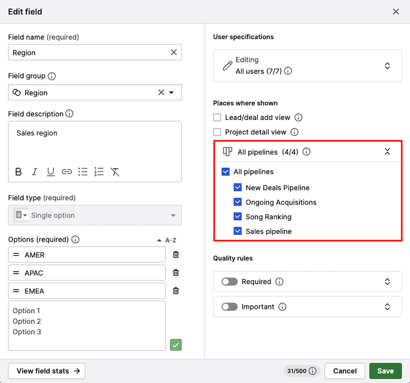You can choose to require fields for specific pipelines or stages, depending on your workflow needs.