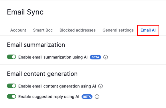 Email AI tools help you streamline communication and automate manual tasks in your inbox. To enable them, open the account menu and go to Personal preferences > Email sync > Email AI.