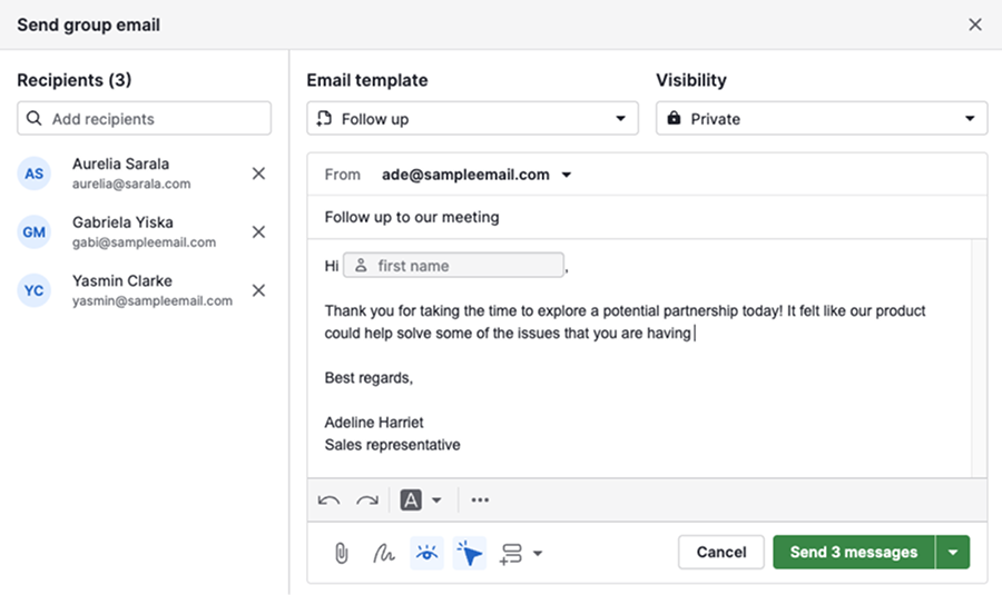 Use group emailing feature to send personalized messages to multiple contacts, each receiving it as if it were sent only to them.