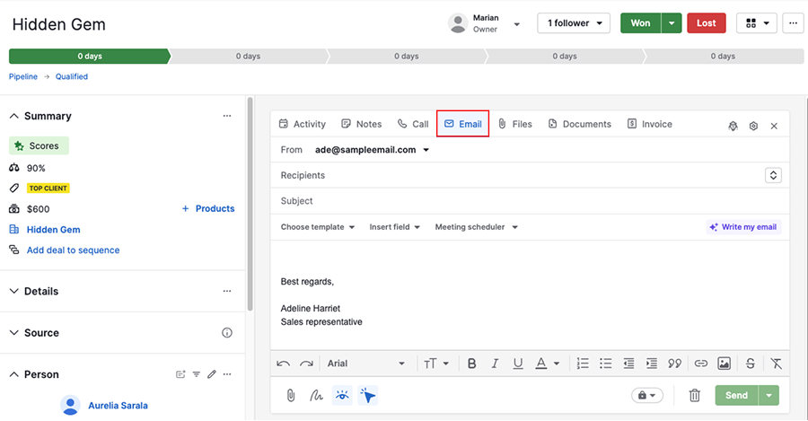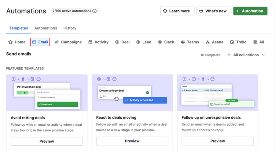 Use email automations to send messages based on either an action or a date. For example, you can trigger an email when a deal is added and send a follow-up if there’s no reply. This helps you stay timely and consistent without manual effort.