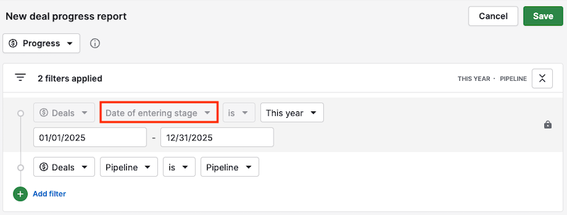 You can always adjust or add filters according to the data you want to see, but the date of entering stage filter is locked in since it‘s needed to assess deal progress.