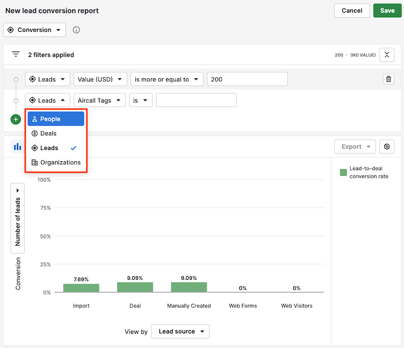 Choose to either generate a report with AI or build one manually by selecting Report > Lead > Conversion, then click “Continue”.