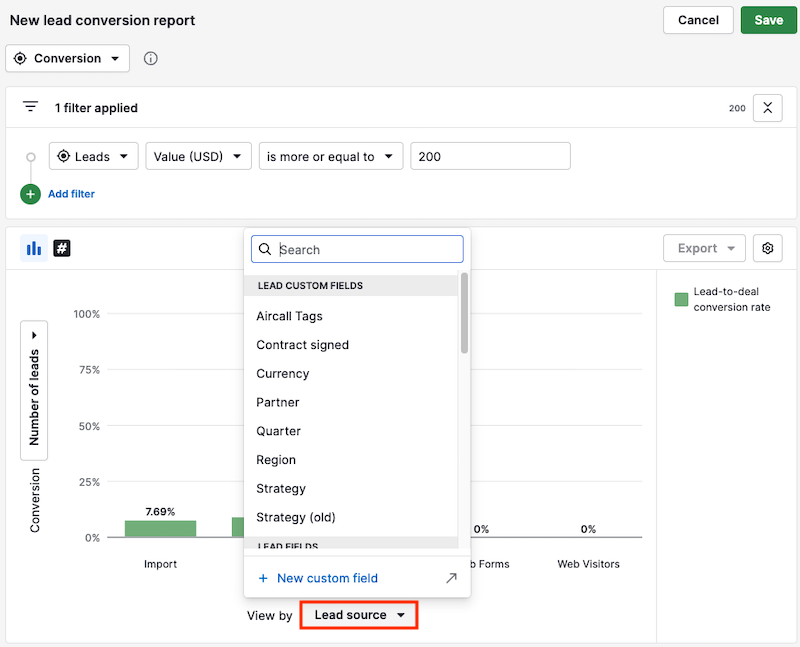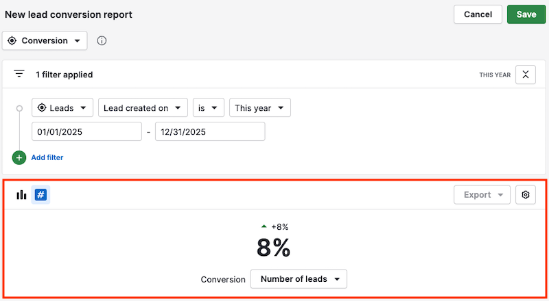 By default, the report shows your lead-to-deal conversion rate for leads created this year, grouped by lead source.