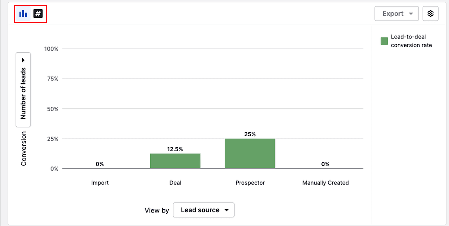 Hover over a column to compare conversion rates. In this example, 17 leads came from deals and another 17 were added manually. Manual leads had a higher conversion rate, with two out of 17 converted to deals.
