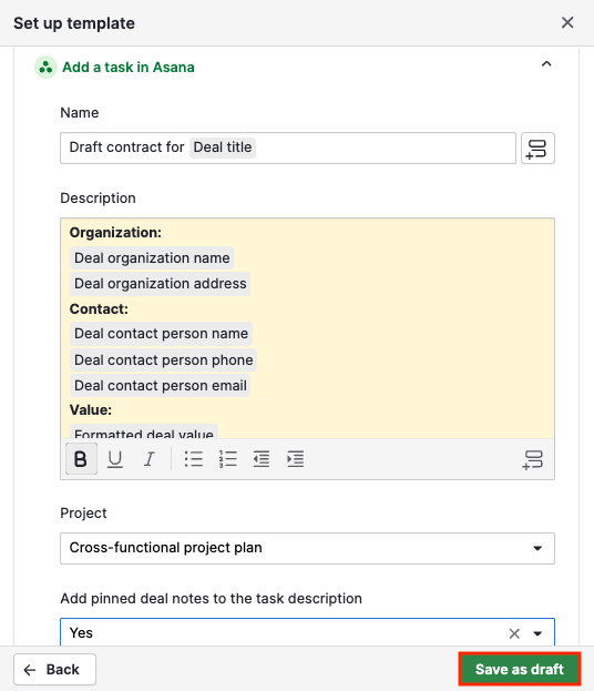 Select the project where you‘ll create the task, if you want to add pinned notes to the description for added context, and finally, click “Save as draft.”