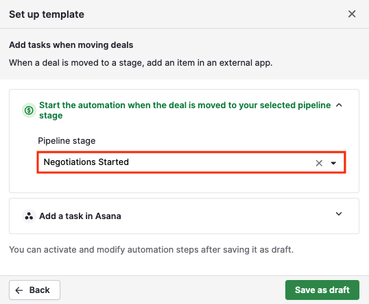 • Add tasks when moving deals: When a deal is moved to a stage, create a task or a project in Asana