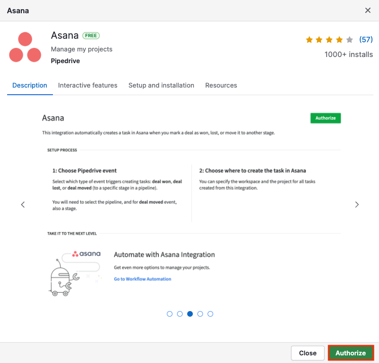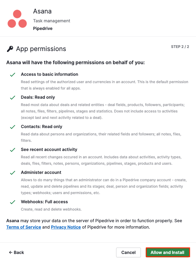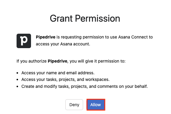 If you‘re already logged in, you‘ll be prompted to grant Pipedrive permission to access your Asana account. Click “Allow” and you can proceed to setting up your integration.