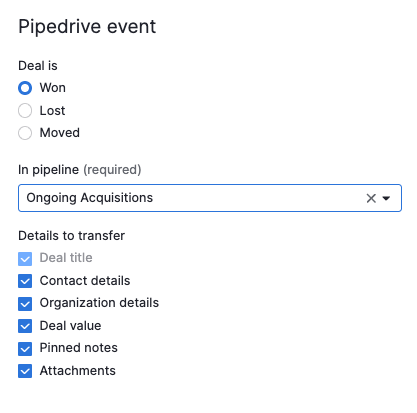 On the left, under Pipedrive event, you‘ll choose what will trigger the information transfer.
