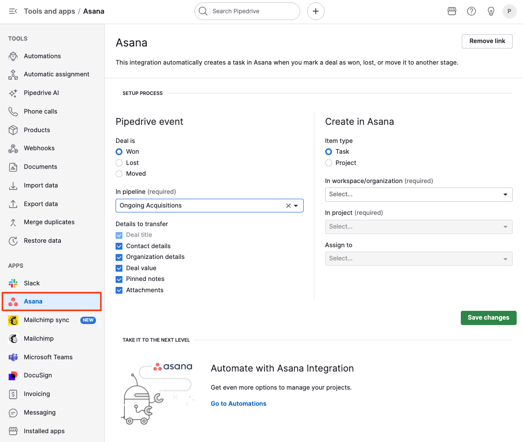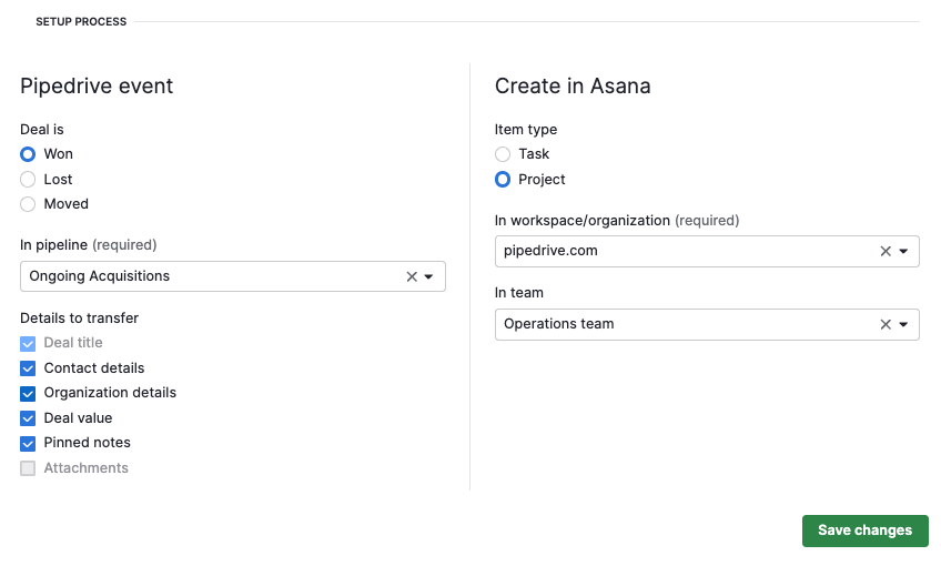 Once you‘re satisfied with your selections, click “Save changes.” After that, every deal that meets your rule criteria will create a task or project within Asana with the specified information, allowing your teams to follow up on your deals effectively.