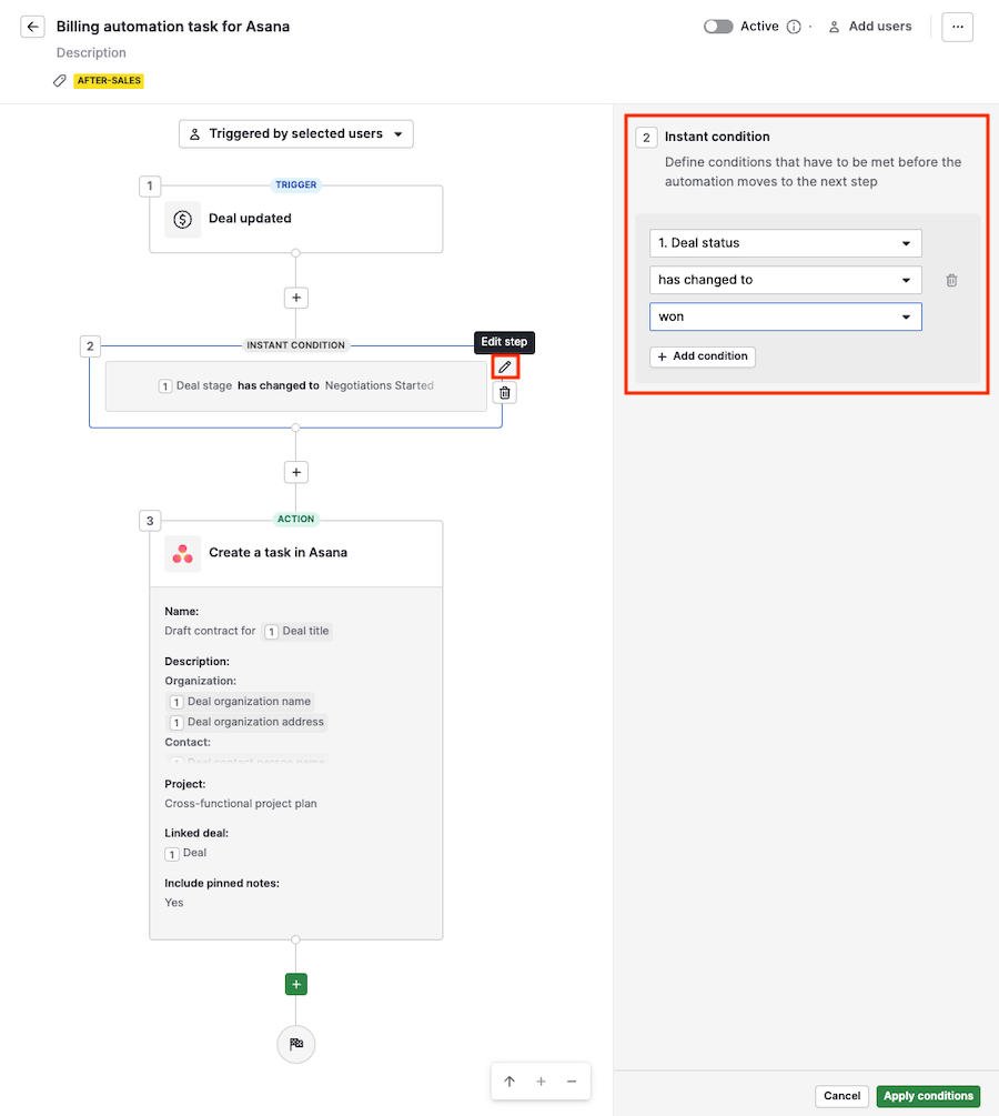 Let’s say you prefer the automation to trigger whenever a deal is won. Click the pencil icon next to the instant condition and change the dropdowns to Deal status has changed to won and click “Apply conditions.”