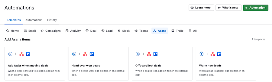 To get started, go to Automations in Pipedrive, open the Templates tab, and select the Asana category to choose from four ready-made templates: