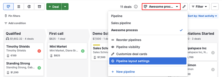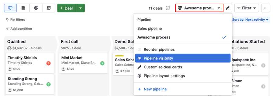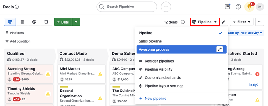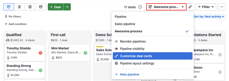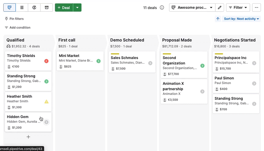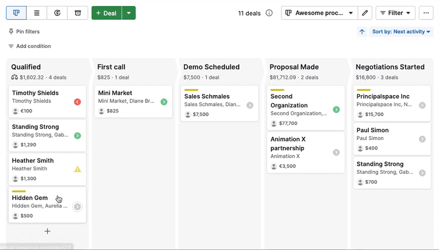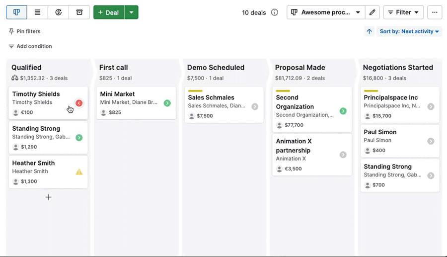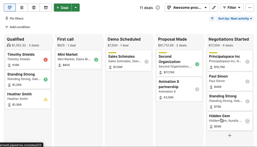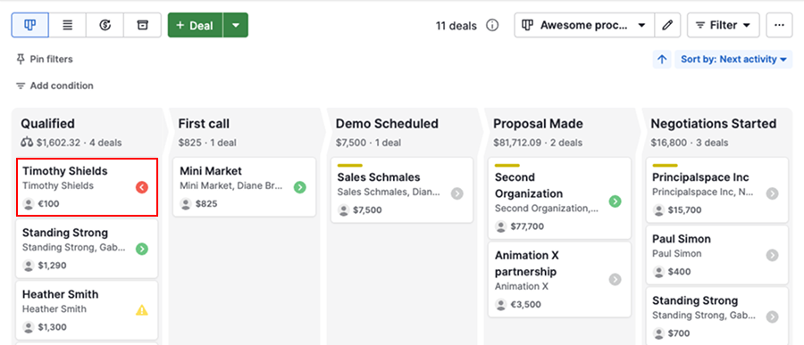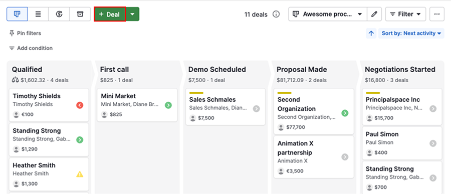 By default, deals are sorted by next activity, helping you prioritize what needs attention first.