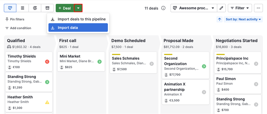 If you want to add multiple deals at once, use the dropdown next to the add button to import your data.