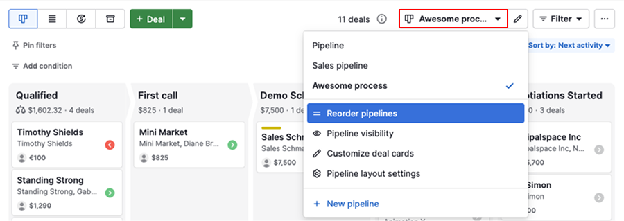 Organize your pipelines by priority to make navigation easier for your team. Open the pipeline selection dropdown and click “Reorder pipelines” to adjust their order.