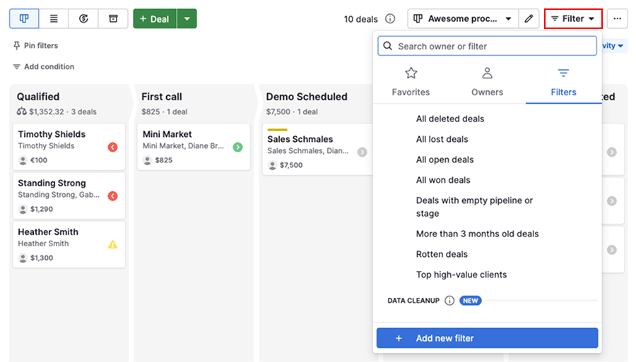 To find specific deals, go to Filter > Filters. Select an existing filter or click “+ Add new filter”.