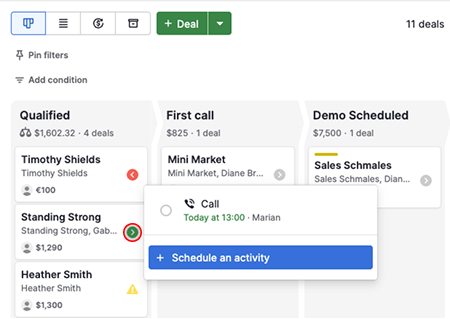 To check upcoming activities, click the activity icon on the card. From there, you can mark activities as done or schedule new ones.