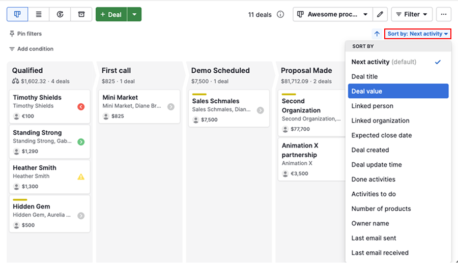 For example, you can sort by fields such as deal value, expected close date or owner, depending on your priorities.