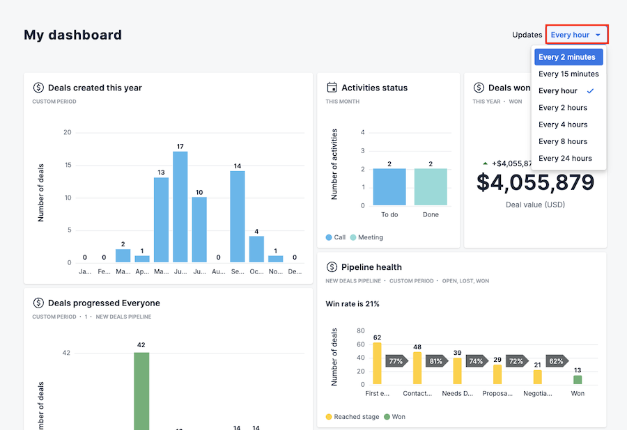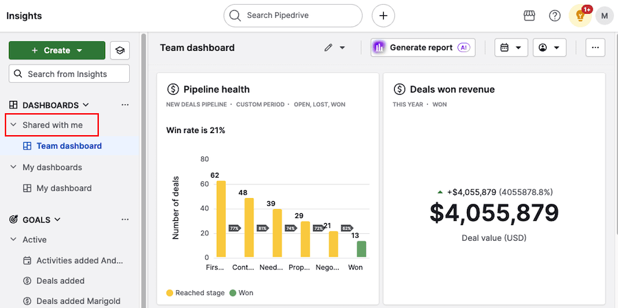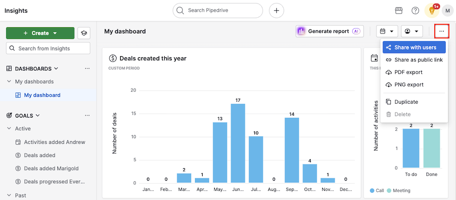 You can share your Insights dashboards internally with your team or externally with people outside of Pipedrive.