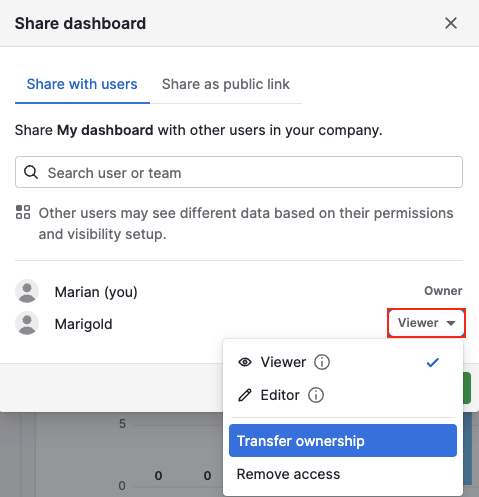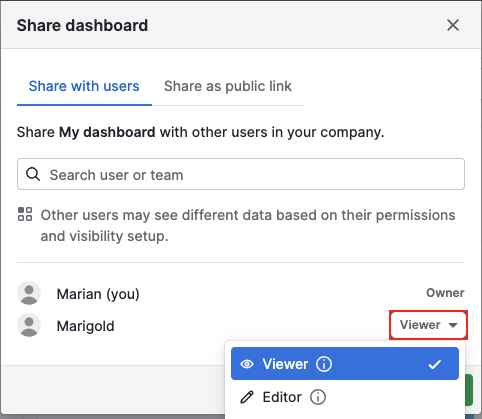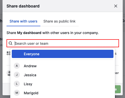 You can share dashboards internally with everyone, selected users or teams. Use the search bar to choose who should have access.