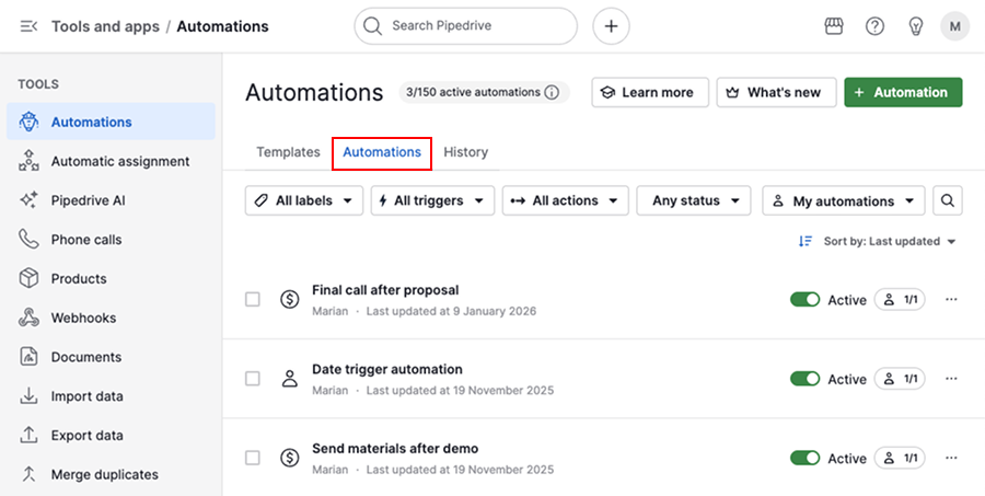 Use the automations tab to review and manage your automation setup.