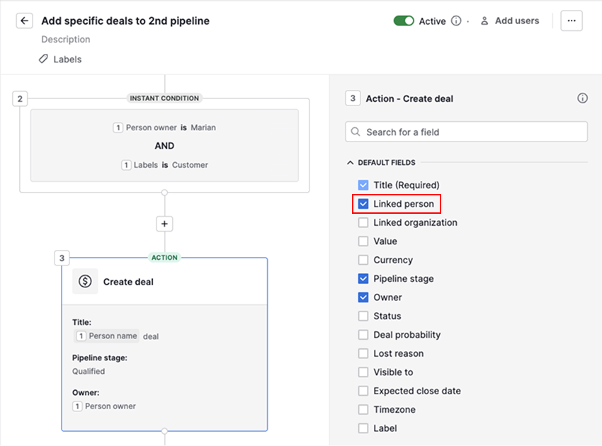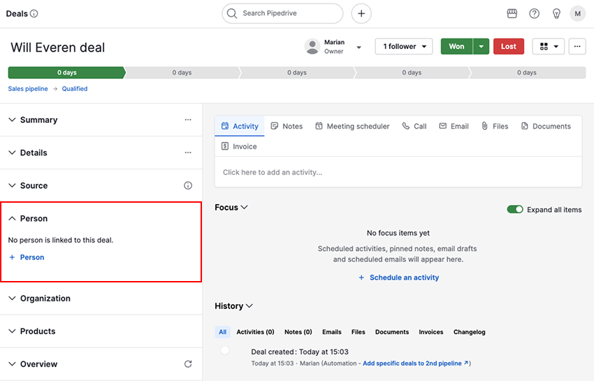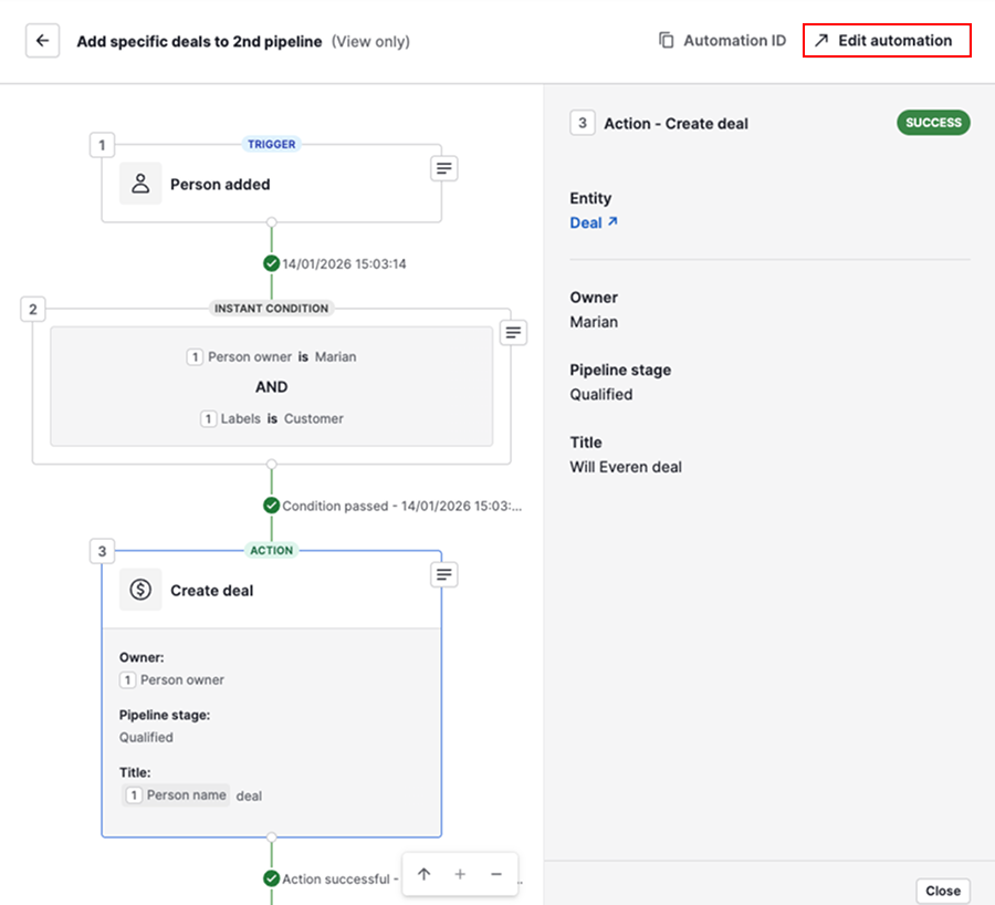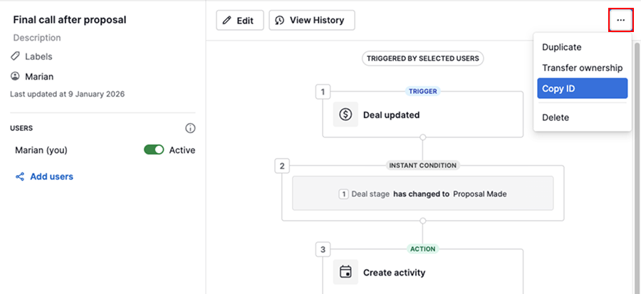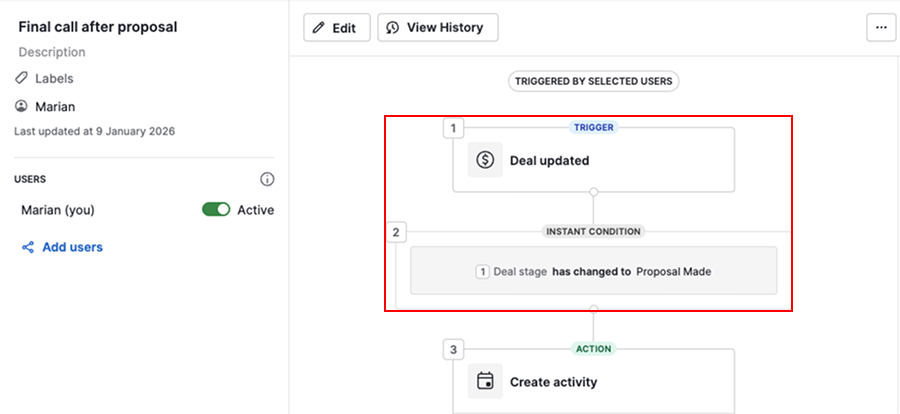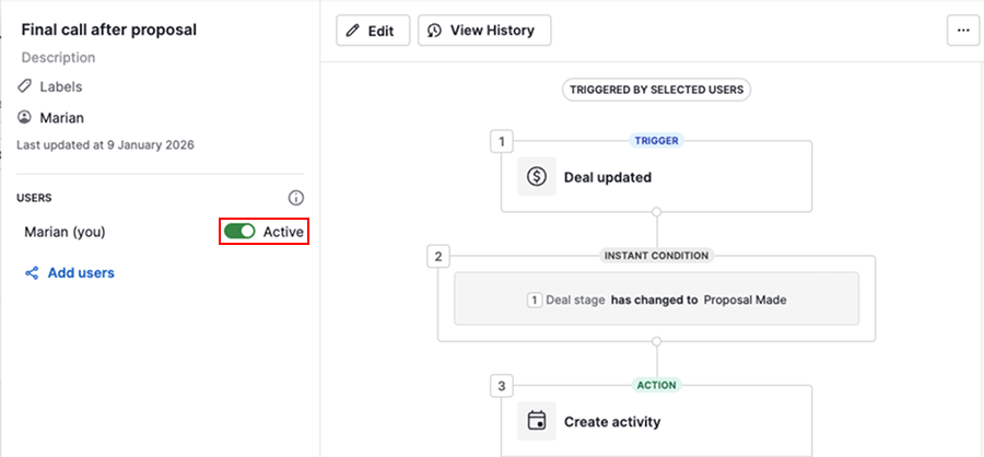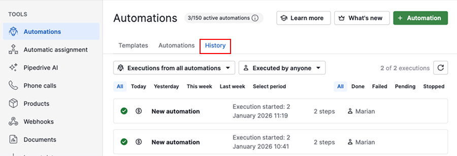 If your automation is set to create a deal, lead, contact, organization, project or activity, but you can’t find it in your account, open the history tab and check the automation execution.